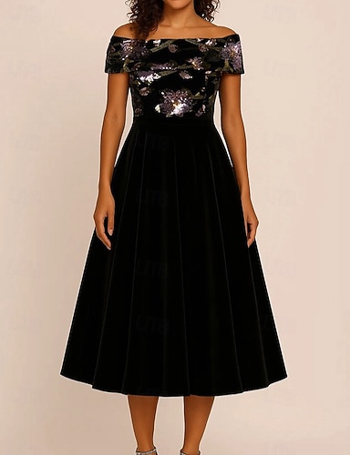 Linea ad A Lunghezza Tè Abiti da Cocktail Elegante Manica 3/4 Scollo a Barca Festa in giardino Matrimonio Con Paillettes con Glitter