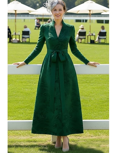 Linea ad A Lunghezza alla caviglia Abito Derby Abito da cerimonia per signora Manica Lunga Scollo a V Elegante Vintage Derby del Kentucky Jacquard con Fascia / Nastro Fiocco/Fiocchi