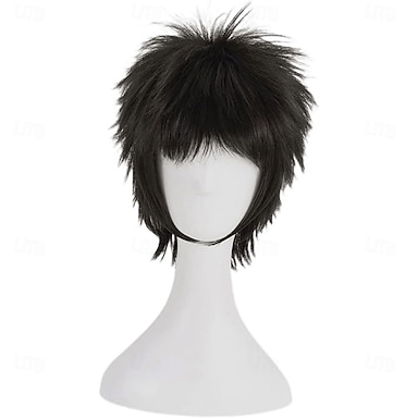 Parrucca da cosplay parrucca sintetica ricci sciolti parrucca asimmetrica corta capelli neri sintetici naturali 10 pollici parrucche nere soffici da uomo Halloween