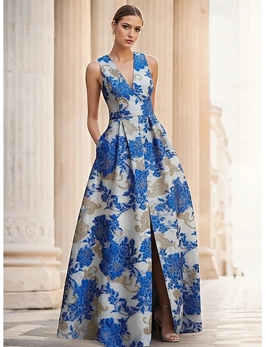Linea ad A Lunghezza al pavimento Abito da Sera Elegante Vintage Floreale Senza Maniche Scollo a V Matrimonio Formale Jacquard con Stampa floreale Pieghe Tasca