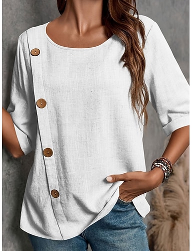Per donna Blusa Camicia in finto lino Bottoni Tinta unica Quotidiano Elegante Casual Mezza Manica Girocollo Top Regolari Quotidiano Blu Nero Bianco Rosso Verde Estate Primavera