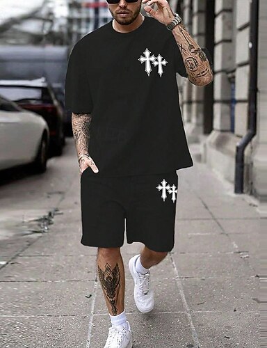 Pasqua Per uomo Croce 2 pezzi Set di magliette Top estivi Manica Corta Pantaloni corti Girocollo Vintage Athleisure Sport & Outdoor Sport Casual Quotidiano Girocollo Estate Nero