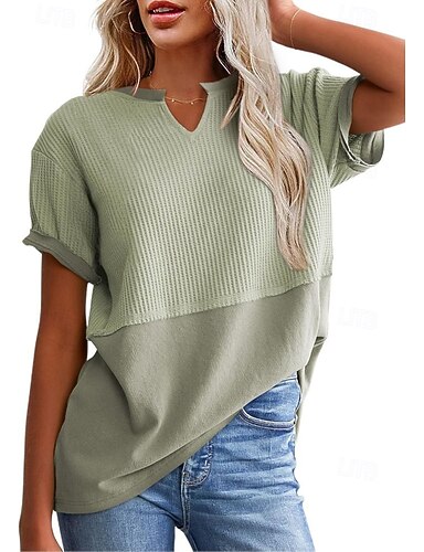 Per donna Maglietta Waffle Maglietta Patchwork Polsino arrotolato Vintage Elegante Casual Manica Corta Scollo a V Top lunghi Quotidiano Uscire Blu Verde acqua Verde salvia Nero Bianco Estate Primavera