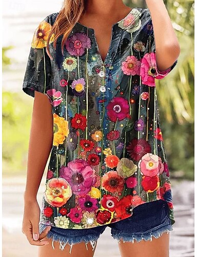 Per donna Maglietta Stampato Floreale Grafico Elegante Classico Manica Corta Scollo a V Top Regolari Casuale Quotidiano Blu Rosa Rosso Arancione Verde Estate Primavera