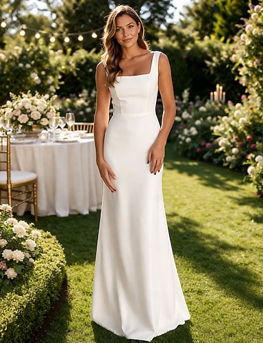 Tubino Colonna Lunghezza al pavimento Luna di miele Abiti da sposa Abito da sposa Casual Senza Maniche Collo quadrato Laurea Compleanno Tessuto Elasticizzato con Fascia / Nastro