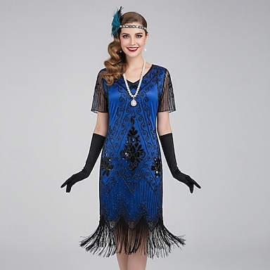 Anni Ruggenti Anni 1920 Lunghezza al ginocchio Abito Flapper Abiti Set di accessori Maniche corte Il grande Gatsby Invitato al matrimonio Paillettes Frangia con nappe Paillettes Nappa Scollo a V