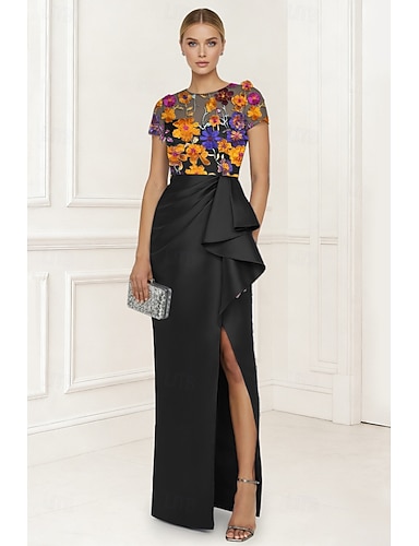 Tubino Colonna Lunghezza al pavimento Perline ricamate Abito Formale Abito da madre della sposa Abiti da Cocktail Abiti da festa Elegante Abito Nero Setoso Manica Corta Girocollo Festa in giardino