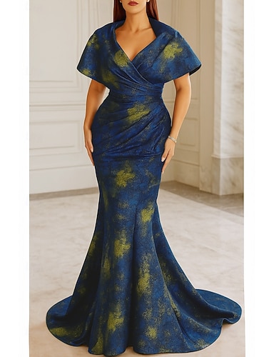 Sirena Tromba Lunghezza al pavimento Abito da Sera Elegante Setoso Manica Corta Regina Anna Matrimonio Formale Tasca Nylon con Stampa floreale