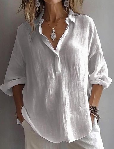 Per donna Camicia Blusa Finto cotone e lino Bottoni Semplice Casual Manica Lunga Colletto a Camicia Top Regolari Quotidiano Ferie Uscire Bianco Estate Primavera