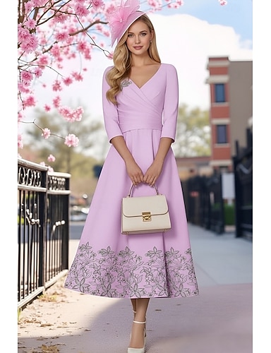 Linea ad A Abito Lunghezza Tè Perline ricamate Vestito da Festa Abito da Cocktail Abito da cerimonia per signora Manica 3/4 Scollo a V Elegante Semplice Formale Raso con Pizzo Arricciato Paillettes