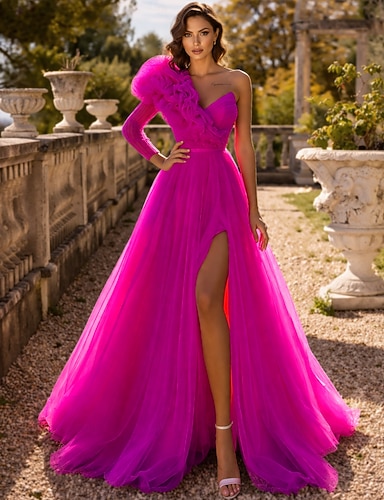 Abito da ballo Strascico a Terra Abiti da Ballo Abito da Sera Da principessa Abito formale Elegante Sbuffato Manica Lunga Monospalla Balli di fine anno Compleanno Tulle con Volant Spacco