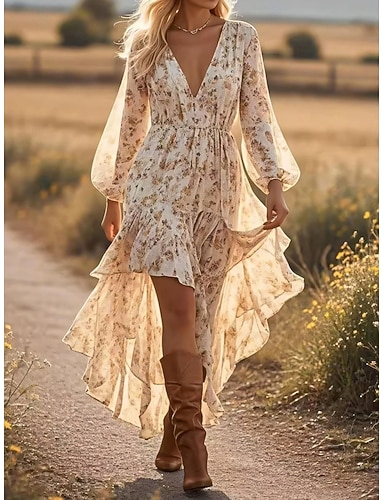 Abito maxi Boho da donna abito a linea casual all'aperto uscite vestibilità ampia grafica floreale maniche lunghe scollo a V blu beige estate primavera autunno