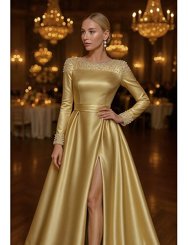 Abito a-line lungo fino al pavimento abito da sposa abiti formali abito da sera abito madre della sposa maniche lunghe scollo tondo elegante vintage festa satinato con pieghe paillettes spacco