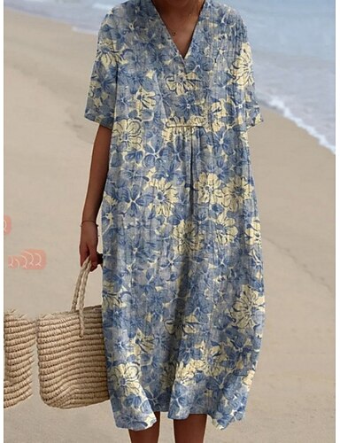 Vestito maxi da donna abito casual abito casual vacanza vestibilità ampia grafica floreale in lino simile a manica 3/4 girocollo blu viola chiaro verde beige primavera autunno inverno