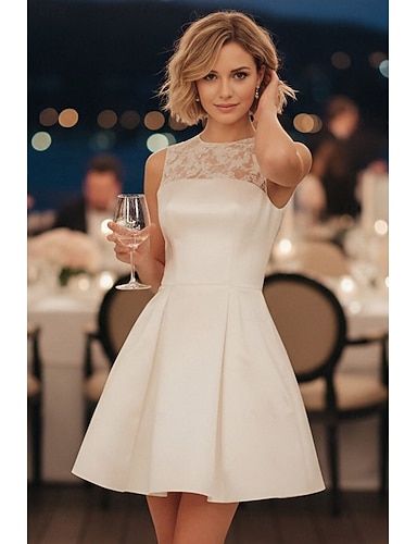Linea ad A Corto Mini Abito in Raso Abito Bianco Abiti da sposa Abito da sposa Elegante Piccoli Abiti Bianchi Senza Maniche Girocollo Formale Laurea Raso con Pizzo Pieghe