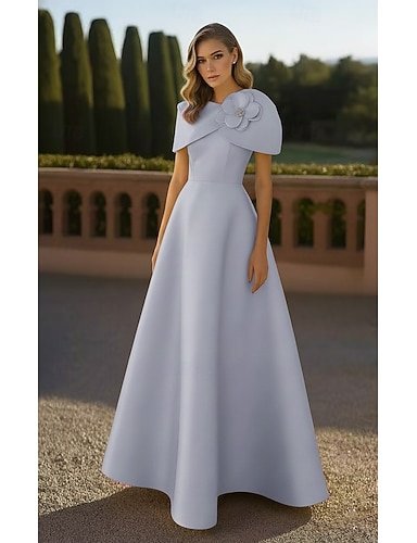 Linea ad A Lunghezza al pavimento Abito da ballo con mantello Abito da Sera Elegante Setoso Manica Corta Girocollo Matrimonio Formale Raso con Cristalli Fiore sulla Spalla