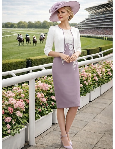 Due Pezzi Tubino Colonna Set di Abiti Lunghezza al ginocchio Abito da invitata a nozze Abito da cerimonia per signora Manica 3/4 Collo gioiello Elegante Ospite di nozze Chiesa Chiffon Raso Pizzo