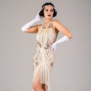 Vintage Anni Ruggenti Anni 1920 Lunghezza al ginocchio Abito Flapper Guanti Copricapo Maniche corte Il grande Gatsby Charleston Paillettes Frangia con nappe Costume Per donna Halloween Carnevale