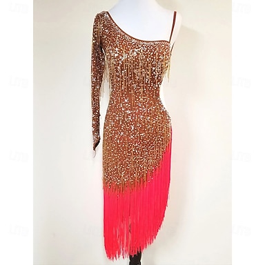 abito da ballo latino monospalla con frange e perline di cristallo, abito da esibizione di salsa e tango in oro e rosa