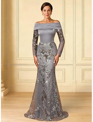 Sirena Tromba Strascico a Terra Perline ricamate Abito Formale Abito da madre della sposa Abiti da Ballo Abito da Sera Da principessa Abito formale Elegante Stile Celebrità Brillanti Manica Lunga