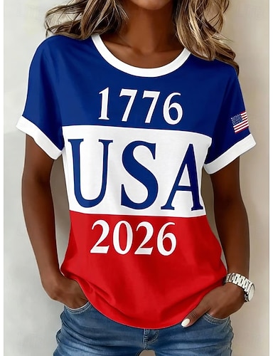 T Shirt patriottica delle donne americane per il 250° anniversario Stampa a Blocchi di Colore Grafica Lettera Bandiera Americana Elegante Classica Casual Maniche Corte Collo A Giro Top Regolari