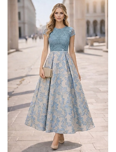 Abito da Prom A-Line di Lunghezza Tea Abito da Festa Abito da Cocktail Abito per Madre della Sposa Manica Corta Collo Rotondo Elegante Vintage Festa Ospite di Nozze con Ricamo Colore Blocco