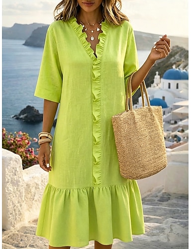 Per donna Abito al ginocchio Abiti di lino Abito in lino Essenziale Spiaggia Vacanza Vestibilità comoda Colore Puro Mezza Manica Scollo a V Nero Bianco Verde Estate