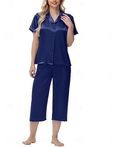 Per donna Pigiama Casual Morbido Raso Colore Puro Tasca Bottoni Pantalone Quotidiano Casa Da letto Manica Corta Colletto a Camicia Nero Champagne Rosa Rosso Blu marino Estate Vestibilità comoda