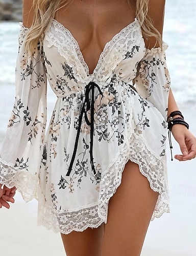 Per donna Mini Abito Abito Boho Abito occidentale Moda Quotidiano Vacanza Uscire Vestibilità regolare Fiore Manica Lunga Scollo a V Bianco Estate