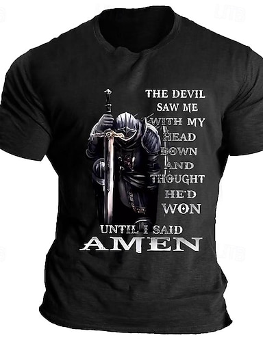 Maglietta grafica a maniche corte per uomo Cavaliere Citazione "Il diavolo mi ha visto... Amen" Motivazione di fede e resilienza