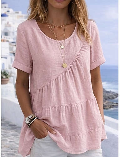 Per donna Camicie di cotone e lino Blusa Bottoni Tinta unica Quotidiano Essenziale Casual Manica Corta Scollo a V Top Regolari Quotidiano Blu Bianco Rosa Rosso Viola Estate Primavera