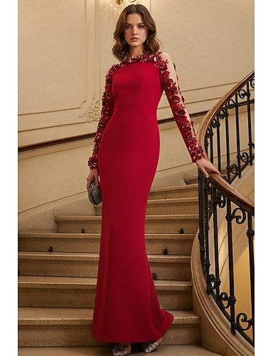 Abito a tubino colonna a lunghezza terra Abito formale Abito da sera Abito da sera Elegante Vintage Maniche lunghe Collo barca Prom Festa con fiori ricamati perline paillettes