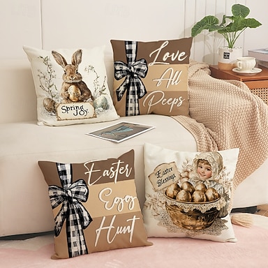 Set di 4 federe per cuscini pasquali vintage con coniglietto, in lino, con stampa su un lato, con federe per cuscini decorativi primaverili per divani.