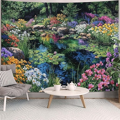 Arazzo da parete con paesaggio naturale di ninfee vibranti, giardino floreale colorato, lago sereno, foresta, decorazione per la casa, soggiorno, camera da letto, sfondo