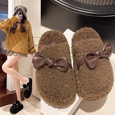pantofole in cotone con suola spessa e calda, con fiocco, pantofole chiuse in peluche per donna, scarpe da interno ed esterno in pelliccia con pile extra