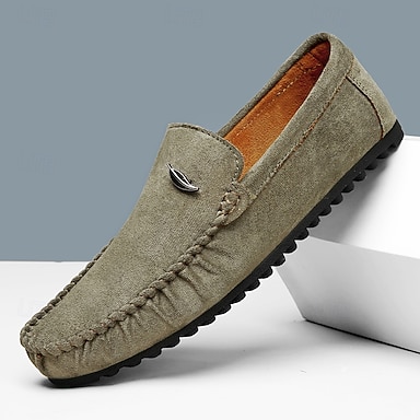 Mocassini da uomo in camoscio color oliva: classiche scarpe slip-on casual, morbide e comode per tutti i giorni.