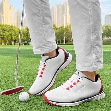 scarpe da golf da uomo ad alte prestazioni in bianco con lacci rossi, microfibra traspirante, ideali per golfisti amatoriali