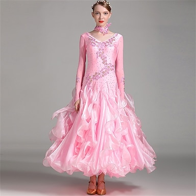 abito da ballo da sala da donna in organza di raso a strati con volant e strass, elegante abito da competizione per valzer, tango, foxtrot – rosa chiaro