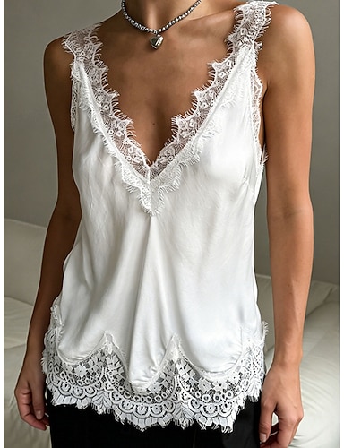 Per donna Camicia Maglietta Top con cuciture in pizzo Top da uscita Pizzo Patchwork Tinta unica Elegante Moda Caldo Senza Maniche Scollo a V Top Regolari Quotidiano Uscire Weekend Bianco Giallo Rosa