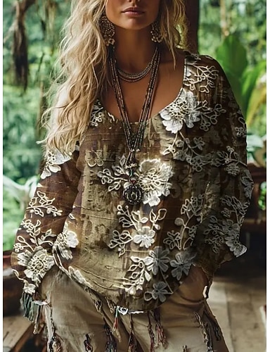 Per donna Camicia Camicia Boho Blusa Stampato Floreale Grafico Bohemien Elegante Classico Manica Lunga Scollo a V Top Regolari Quotidiano Ferie Uscire Marrone Estate Primavera Autunno
