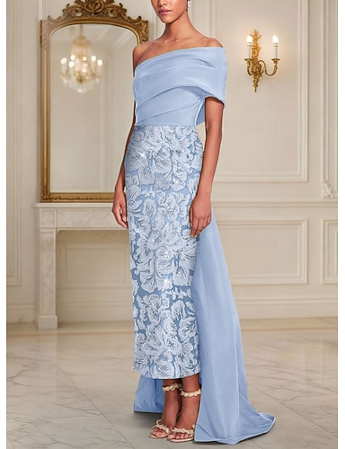 Tubino Colonna Lunghezza al pavimento Abito da Sera Abito da ballo con sopragonna Abito formale Elegante Scintillante Setoso Manica Corta Monospalla Matrimonio Formale Mantelle Raso Pizzo con Glitter