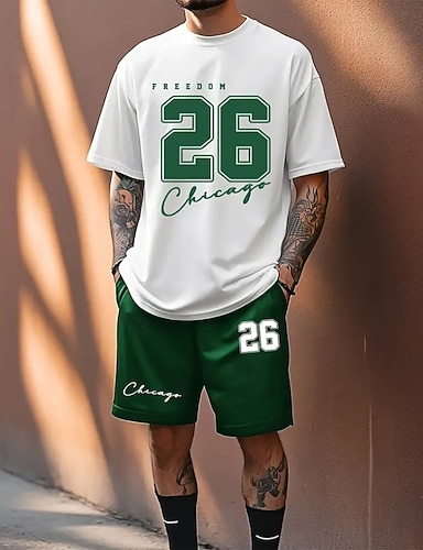 Per uomo Testo / Numero 2 pezzi Set di magliette Top estivi Manica Corta Pantaloni corti Girocollo Athleisure Sport Casual Quotidiano Girocollo Estate Nero Bianco Verde