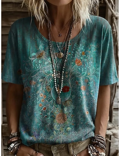 Per donna Maglietta Stampato Floreale Grafico Piante Bohemien Vintage Elegante Manica Corta Girocollo Top Regolari Quotidiano Uscire Weekend Blu Giallo Viola Verde Estate Primavera
