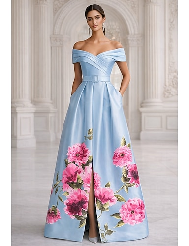 Linea ad A Lunghezza al pavimento Abito da Sera Elegante Floreale Manica Corta Senza Spalle Festa in giardino Matrimonio Tasca Raso con Stampa floreale