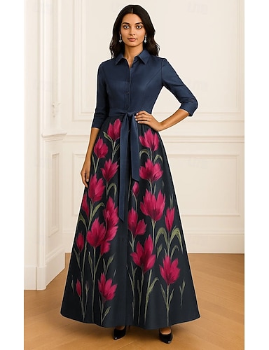 Linea ad A Lunghezza al pavimento Abito da invitata a nozze Abito Formale Abito da sera Abito da cerimonia per signora Manica Lunga Colletto a Camicia Elegante Vintage Formale Raso con Fiocco/Fiocchi