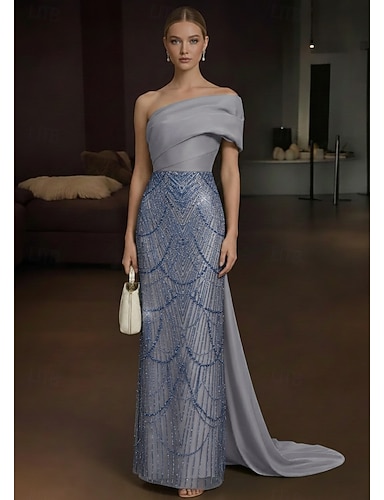 Tute Lunghezza al pavimento Abito da cerimonia per signora Manica Corta Monospalla Elegante Minimalista Formale Ospite di nozze Ricevimento di matrimonio Raso Elasticizzato con Blocco di Colore