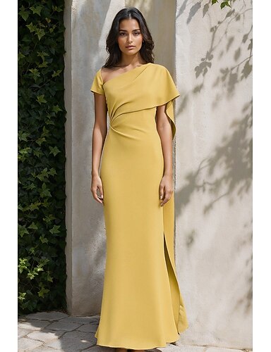 Tuta madre della sposa abito da ospite di matrimonio semplice minimalista spalla unica lunghezza piedi in tessuto stretch di satin maniche corte con arricciature