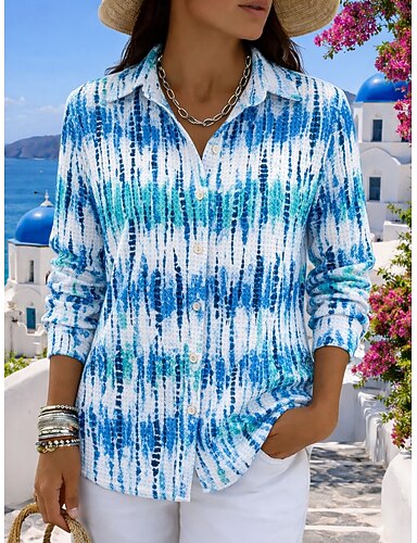 Per donna Blusa Bottoni Stampato A righe Elegante Casual Manica Lunga Colletto a Camicia Top Regolari Quotidiano Blu Estate Primavera Autunno
