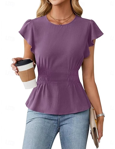 Per donna Blusa Finto cotone e lino Arricciato Tinta unica Essenziale Casual Manica Corta Girocollo Top Regolari Quotidiano Blu Rosa Blu marino Viola Verde Estate Primavera