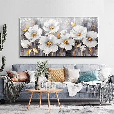 dipinto a olio originale fatto a mano con fiori bianchi su tela, dipinto floreale astratto da parete per l'arredamento della casa con cornice tesa/senza cornice interna